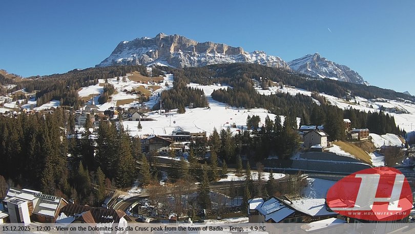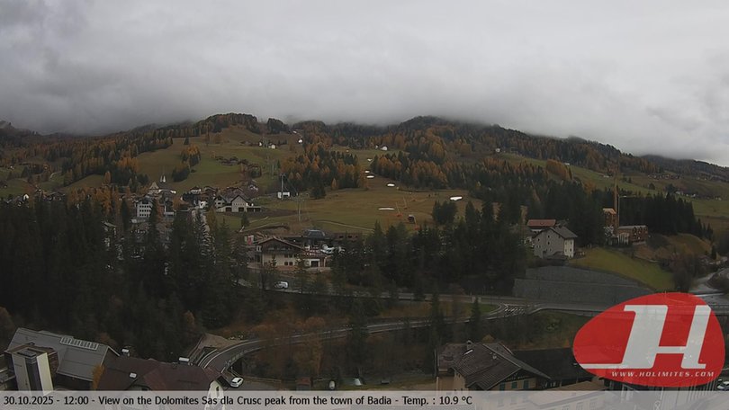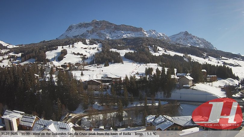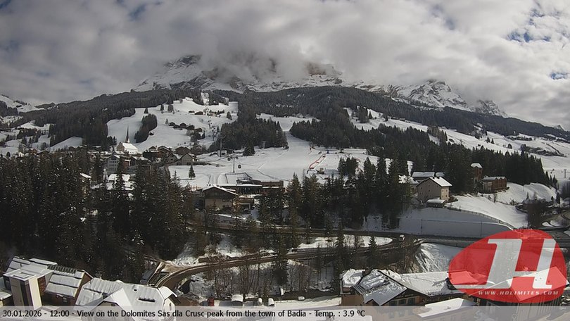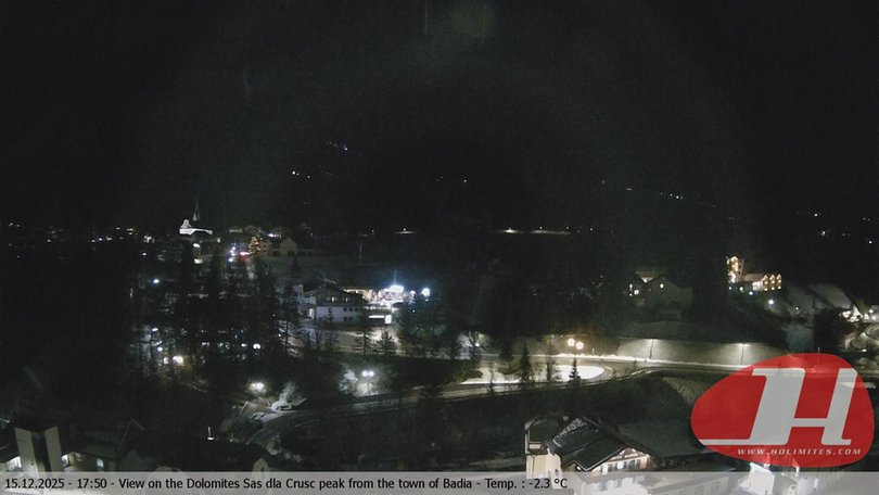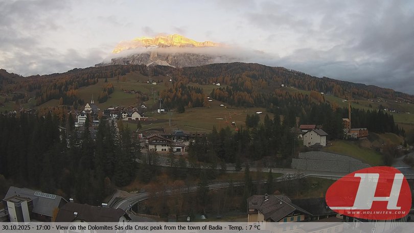 The webcam offers a beautiful view from the village of Badia towards the Sasso di Santa Croce / Heiligkreuzkofel (Sas dla Crusc in Ladin) which, with its vertical wall of 900 m it dominates Alta Badia. In the background, the main peaks of this group of the Dolomites. This webcam allows you to observe the phenomenon of enrosadira that characterizes the Dolomites at sunrise and sunset, making them take on a reddish colour and which is often particularly evident on Sasso Croce / Heiligkreuzkofel. With these images the weather conditions in Alta Badia are always just a click away!