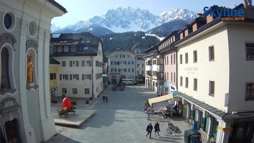The webcam frames the town center of San Candido / Innichen with the square of San Michele and the pedestrian area, which is much loved by tourists for its local artistic craft shops. On the right you can see the baroque church of San Michele, in the background the imposing Rocca dei Baranci (in German: Haunold), this is the highest peak of the Rondoi-Baranci group / Haunoldgruppe, in the Sesto Dolomites / Sextner Dolomiten. This webcam of the Boutique & Gourmet Hotel Orso Grigio is perfect to find out at any time the weather conditions in San Candido / Innichen, in the area of the Three Peaks Nature Park / Naturpark “Drei Zinnen”, in South Tyrol / Südtirol.