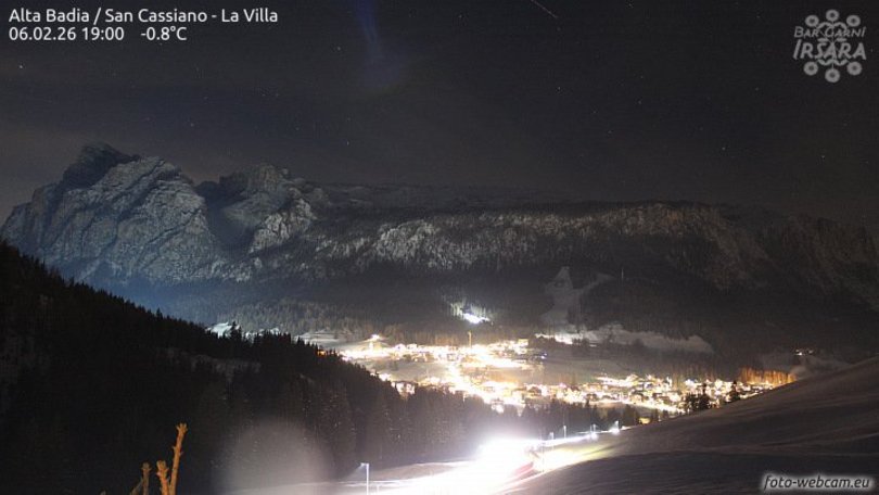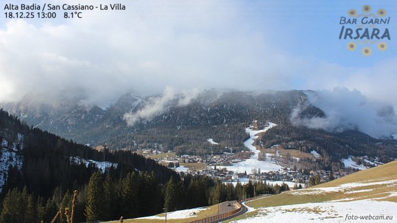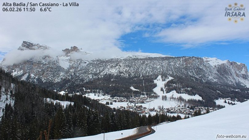 The webcam is located at Garni Irsara in the village of San Cassiano. The beautiful view this webcam offers takes in the village of La Villa, surmounted by Sassongher and Gardenaccia lying behind it. This webcam shows well the ski slopes of Gardenaccia and the weather conditions in Alta Badia.