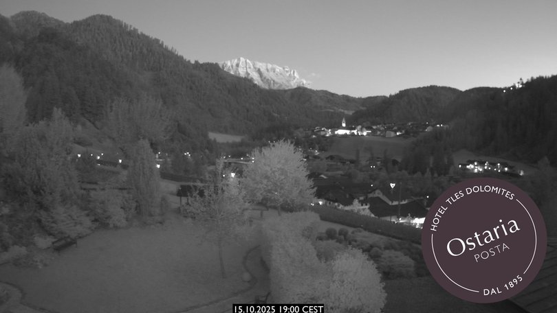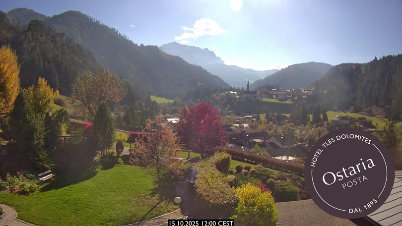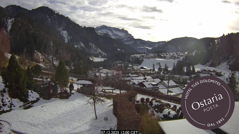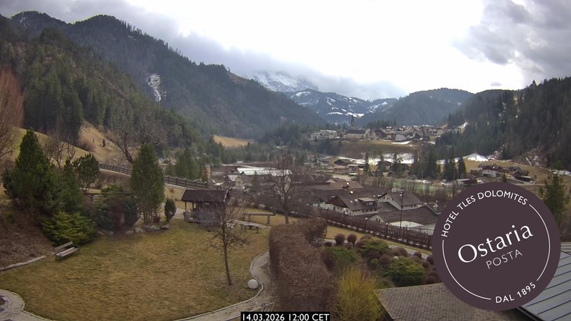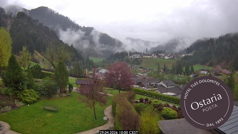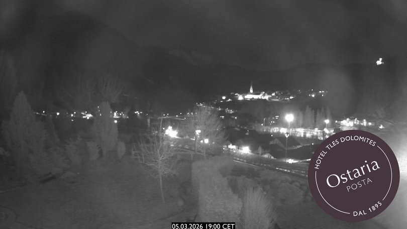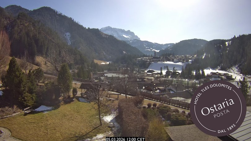The webcam is located on the Hotel Ostaria Posta in Piccolino / Pikolein, in Val Badia / Gadertal. It shows a beautiful view of the village of San Martino in Badia / Sankt Martin in Thurn with its bell tower. In the distance slightly to the right of the image, you can see the tower of the Ćiastel de la Tor, home of the Museum Ladin, dedicated to the Ladin culture and the world of the Ladin Dolomites. On the horizon is a glimpse of the Sasso di Santa Croce mountain group / Heiligkreuzkofel with Mount Cavallo / Rosskopf overlooking the valley. This webcam is ideal for discovering the weather conditions in Val Badia / Gadertal in real time.