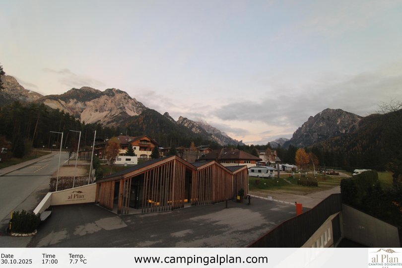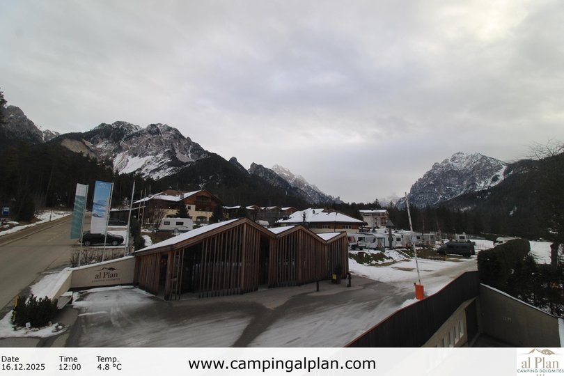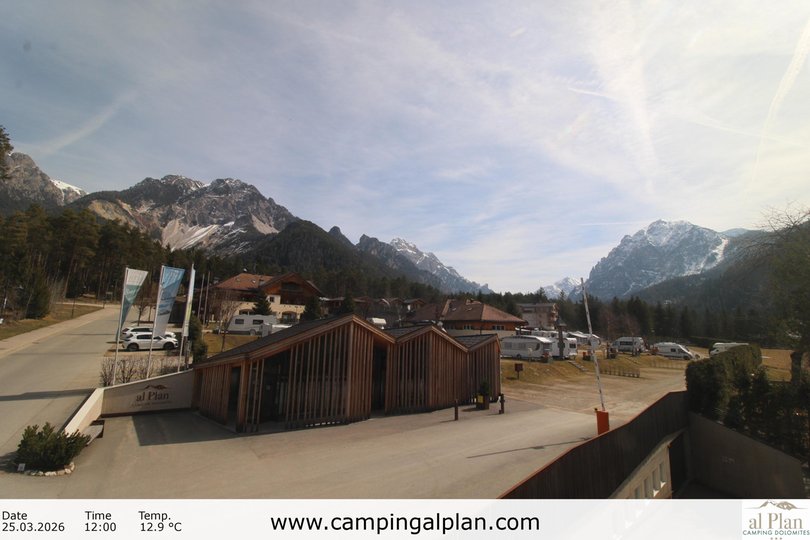 The webcam shows the entrance and reception of Camping AL PLAN in San Vigilio di Marebbe / Sankt Vigil in Enneberg. In the background the peaks of the Dolomites of the Fanes-Senes-Braies / Fanes-Sennes-Prags Nature Park which surrounds the Tamersc Valley. The valley stretches from San Vigilio to Pederü, one of the access points to the wonderful Fanes-Senes-Braies Nature Park.