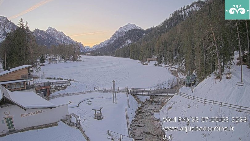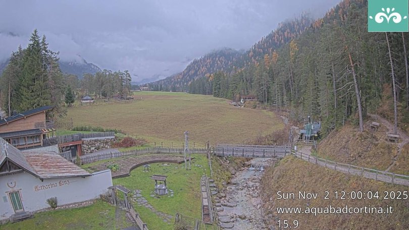 The village San Vigilio is one of the entrance points to the Fanes-Senes-Braies Nature Park. The Dolomites in the back, then woods, meadows and in the foreground the stream Rio San Vigilio. On the lower left you can spot the biological vegetable garden of the Hotel Aqua Bad Cortina that hosts the webcam and behind which lies the cross-country skiing trail. Beautiful places in any season and with any weather!