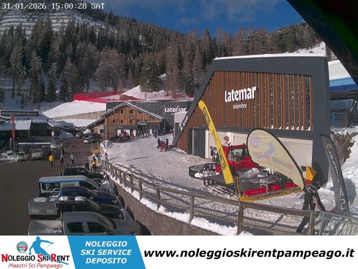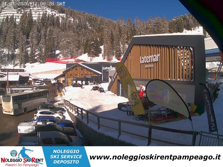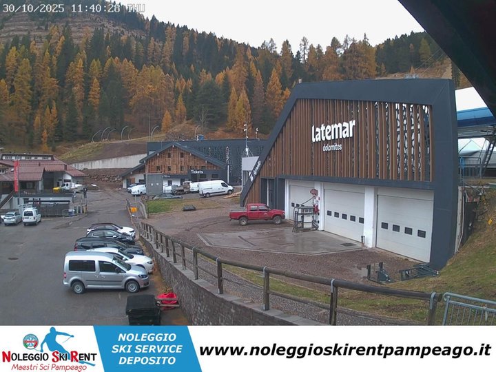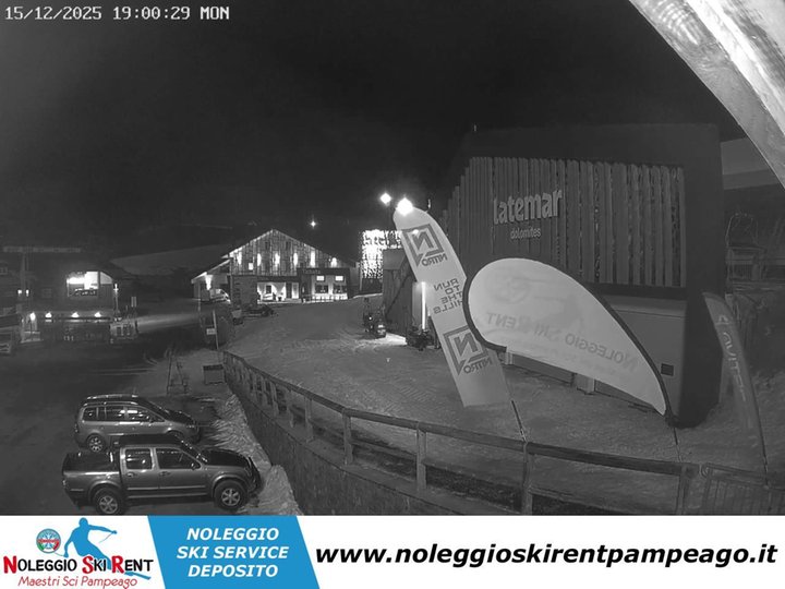The webcam is located at the Alpe di Pampeago ski and snowboard school, at the start of the Monte Agnello chairlift of the Pampeago - Predazzo - Obereggen Ski Area. Further on you can see the Latemar chairlift, which allows skiers to connect to the ski resorts of Predazzo and Obereggen in the Ski Center Latemar. With this webcam you can find out the weather and snow conditions in Pampeago, a ski resort in Val di Fiemme / Fleimstal, in Trentino / Trient, at any time.