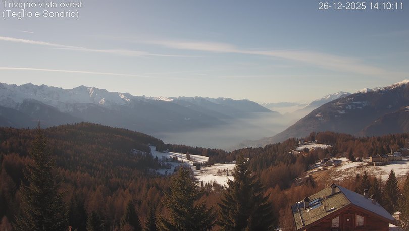The webcam offers a panoramic view of a section of the Valtellina / Veltlin region. In the foreground and on the right, you can see part of the town of Trivigno Bassa, with the Church of San Gaetano. The Pian di Gembro Nature Reserve is located a few kilometers further downstream. In the background on the right, you can see part of Alpe Teglio. In the background and on the left, you can see a portion of the chain of the Orobic Alps / Bergamasker Alpen with Pizzo Coca, called King of the Orobie for its 3.052m of altitude. Downstream in the centre, a glimpse of the towns of Teglio and Sondrio / Sünders. This webcam is perfect for finding out what the weather is like in this area of Lombardy / Lombardei.
