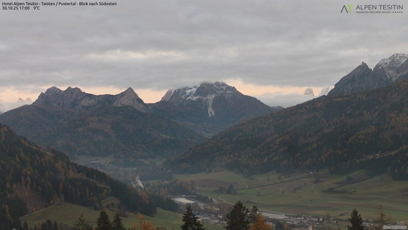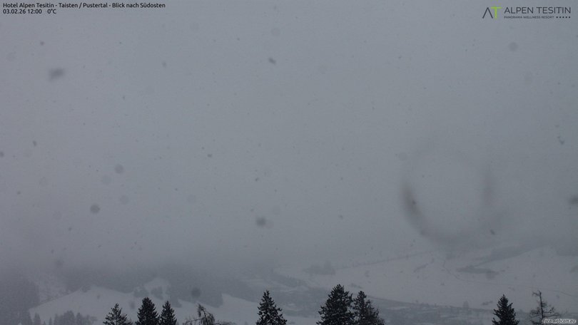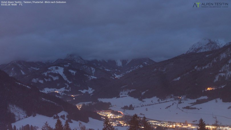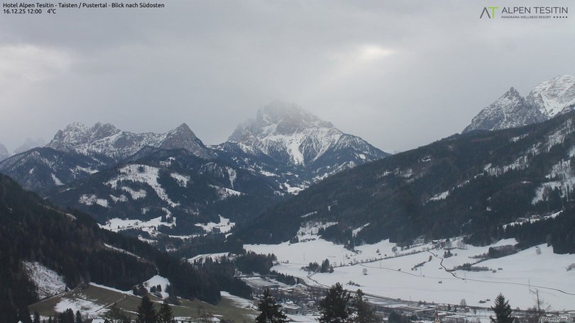The webcam is located on the top floor of the Hotel Alpen Tesitin in Tesido / Taisten. It offers a wonderful view shot of the Braies Dolomites / Pragser Dolomiten, among which stands the Vallandro Peak in the center. In the foreground you can see the meadows and forests that surround Tesido / Taisten and Monguelfo / Welsberg. This webcam allows you to see the weather and snow conditions in this area of Val Pusteria / Pustertal, in South Tyrol / Südtirol, at any time.