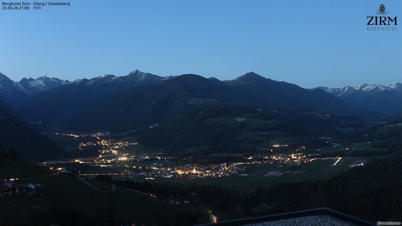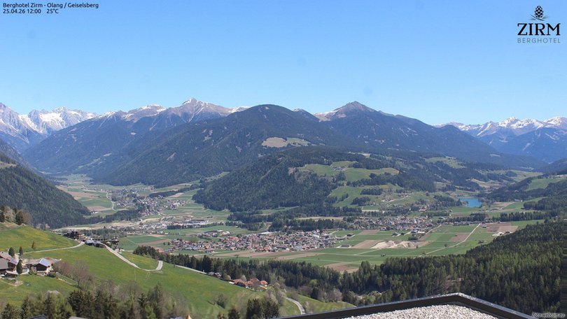 The webcam is positioned on the roof of the Berghotel Zirm, in the hamlet of Sorafurcia / Geiselsberg which is close to the slopes of the Plan de Corones / Kronplatz ski area. It offers a panoramic view of the village of Valdaora / Olang. On the left side of the image extends the Valley of Anterselva / Antholzer Tal while a on the right the Pusteria / Pustertal Valley, with the artificial lake of Valdaora / Altholzer See, also called Lake of Monguelfo / Welsbergsee. This webcam is ideal for discovering the weather conditions in real time in this area of South Tyrol / Südtirol, near Brunico / Bruneck.