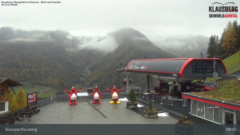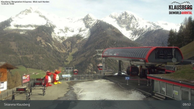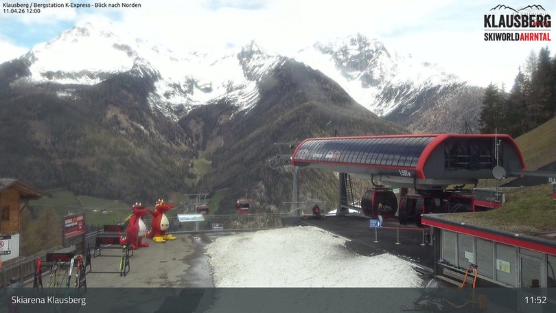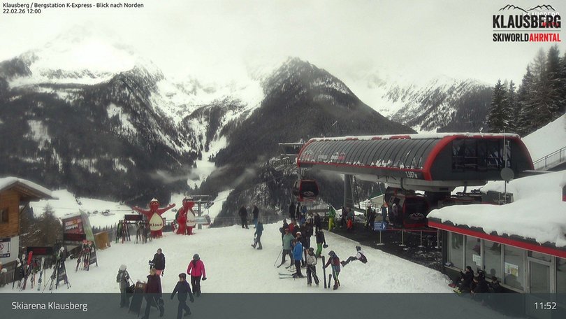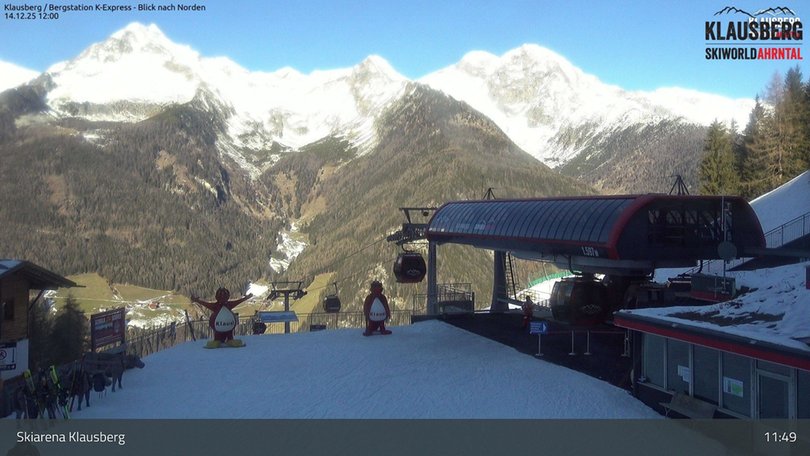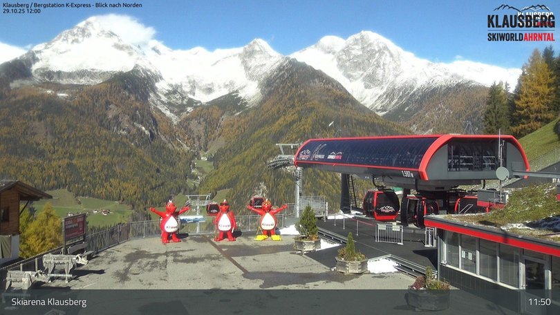 Panorama from the mountain station of the cable car K-Express in the ski area Klausberg, part of the Skiworld Ahrntal. The view goes northwards, crosses the Ahrntal at the level of Cadipietra / Steinhaus, and rests on the Zillertal Alps, on the border between Italy and Austria. On the left, you may spot the gourmet ski hut Kristallalm that offers culinary experiences, apéritifs, and fun après-ski. Look at this webcam to control the weather conditions in the Ahrntal and to discover if the Zillertal Alps are already covered in snow.