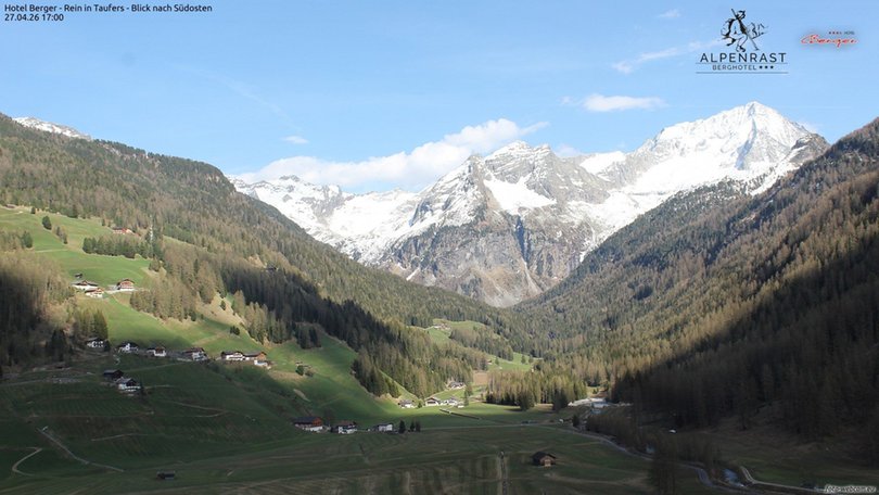 Panoramic view from the Hotel Alpenrast in Riva di Tures / Rein in Taufers in the Ahrntal in southeastern direction towards the Hochgall. Riva di Tures / Rein in Taufers is surrounded by the Durreck Group and the peaks of the Rieserferner Group, to whom also the Hochgall belongs. With its northern wall of 3.436 m a.s.l., the latter also wins the title of the highest mountain of the Deferegger Alps. This webcam is the perfect observation point to control the weather conditions in this part of the Ahrntal and to discover if the first snow has already fallen in Riva di Tures / Rein in Taufers.