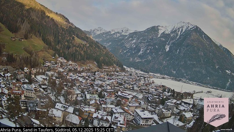 The webcam shows the panorama towards Bruneck from the AhriaPura apartments in Sand in Taufers. From left to right, the peaks of Gatternock, Achternock, Wasserfallspitz and Blossberg which dominate the Tures / Tauferer Valley. There are many outdoor activities to do in this tourist area, from hiking in the Vedrette di Ries-Aurina Nature Park / Naturpark Rieserferner-Ahr to mountaineering, from mountain biking to skiing in the Speikboden ski area, to canoeing, paragliding, hang-gliding, fishing and much more. Use this webcam to find out what the weather is like in South Tyrol / Südtirol in the Aurina / Ahrntal and Tures / Tauferer Valley area.