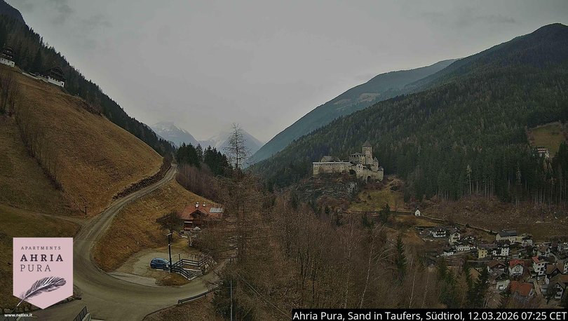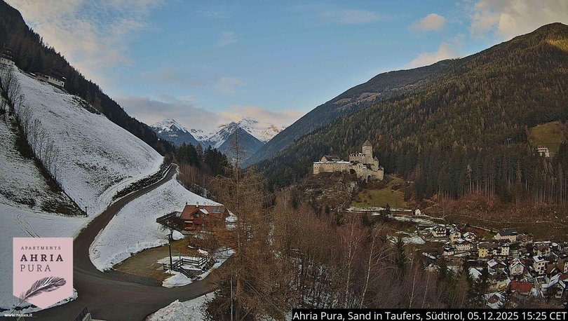 This webcam offers a beautiful view of Taufers Castle / Burg Taufers with the village of Sand in Taufers below. The castle, which can also be visited, dominates the Taufers Valley / Tauferer Tal to the south and guards the entrance to the Ahrntal Valley to the north. In the background of the picture, you can see the mountains Monte Lupo / Wolfskofel, Vordere Hornspitze, Schönberg, Hornspitzen One, Two and Three, Sasso Nero / Schwarzenstein and the western Floitenspitze on the main ridge of the Ahrntal Alps / Ahrntaler Alpen. Use the webcam to check the weather conditions in this area of South Tyrol / Südtirol, near the Skiworld Ahrntal ski resort.