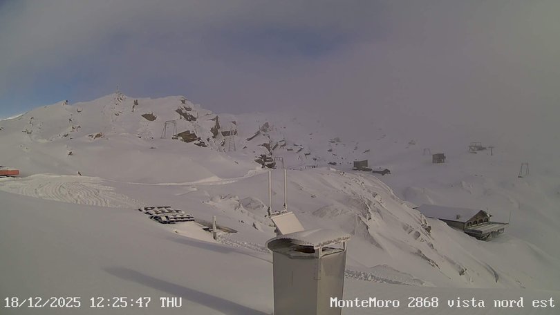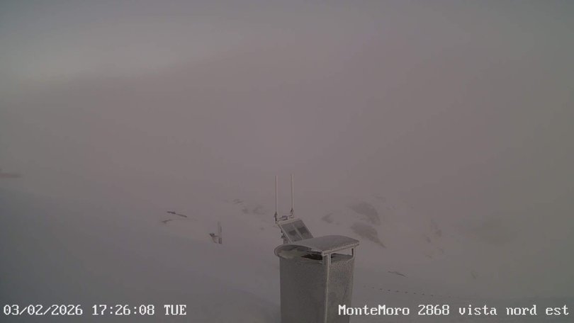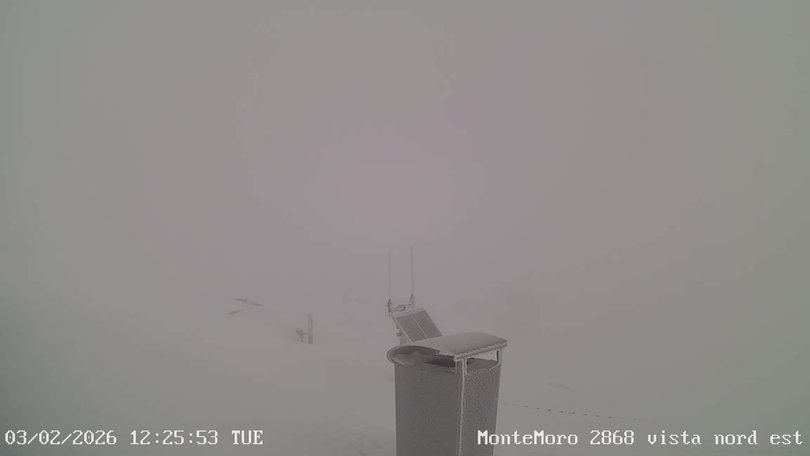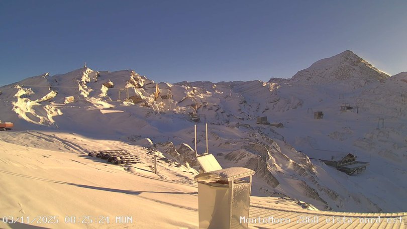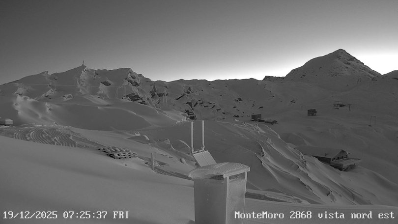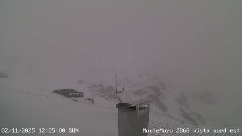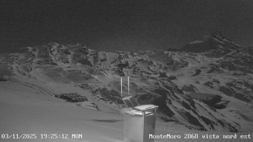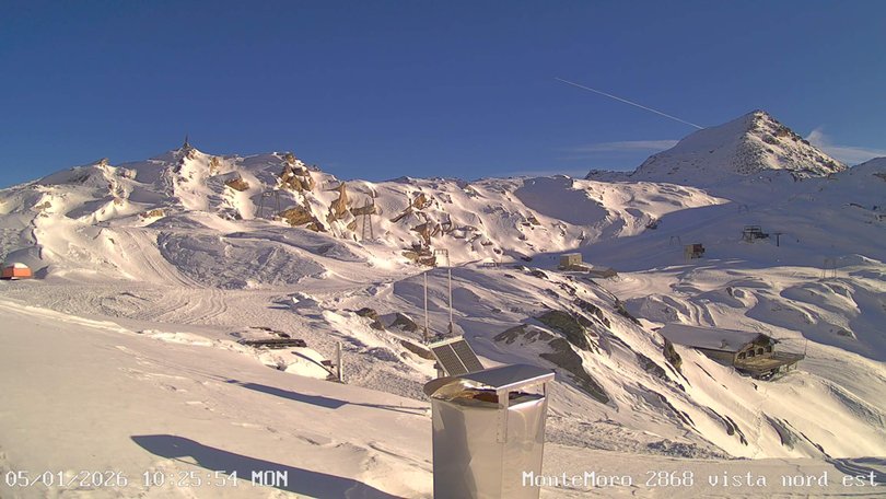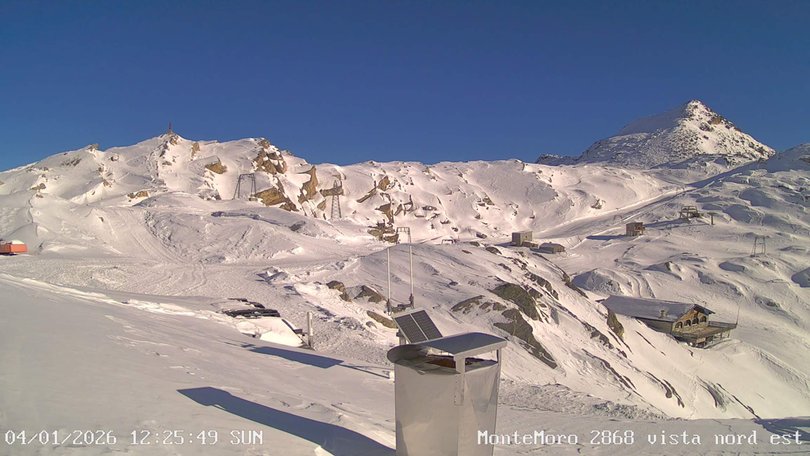 The webcam is located at 2,868 m a.s.l. near the Passo del Monte Moro / Monte-Moro-Pass, which connects Italy (Anzasca Valley) with Switzerland (Saas Valley). The area of the Italian mountainside is also accessible by cableway from Macugnaga. Near the cableway station and located on the ski slopes, is the hut Oberto Maroli from which one can admire the imposing Monte Rosa. Close to the Passo del Monte Moro there's the Lake Smeraldo, and, visible in the images of this webcam, the 5-meter-high statue of Madonna of the Snow.
