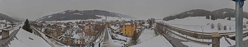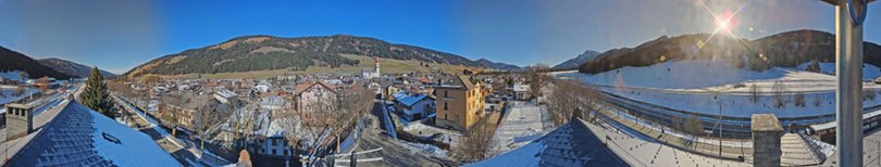 The webcam is located near the railway station in Villabassa / Niederdorf. It offers a panoramic view of the village of Villabassa, situated in the Three Peaks Dolomites / Drei Zinnen Dolomiten holiday region in the Upper Puster Valley / Hochpustertal. In the background of the images, you can spot the peak of Monte Herrenstein to the left, Monte Egger in the centre, and further to the right, Monte Haunold, 2,966 metres above sea level. Villabassa is highly appreciated for its proximity to the 3 Peaks Dolomites ski resort, the Kurpark – a paradise for relaxation and entertainment – as well as for its wide hiking trails and easy-to-navigate cycle paths.