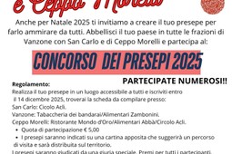 VENITE A SCOPRIRE I MERAVIGLIOSI PRESEPI DELLA VALLE ANZASCA! Anche per il Natale 2025 torna il tradizionale concorso dedicato ai presepi delle frazioni di Vanzone con San Carlo e di Ceppo Morelli. Invitiamo tutti a realizzare un presepe accessibile al pubblico e ad iscriversi entro il 14 dicembre 2025 presso i punti indicati nelle locandine ufficiali. I presepi saranno inseriti in una mappa del territorio e valutati da una giuria speciale, con premi per tutti i partecipanti. Novità 2025 In collaborazione con le... continua