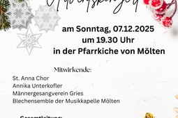Invito al concerto d’avvento domenica, 07.12.2025 alle ore 19.30 nella chiesa parrocchiale di Meltina Partecipanti: Coro Sant’Anna Annika Unterkofler Coro maschile di Gries Ensemble di ottoni della banda musicale di Meltina Direzione generale: Friederike Ladurner Siamo lieti della vostra presenza! L’ingresso è gratuito. Il Coro Sant’Anna sarebbe molto grato per un’offerta volontaria.
