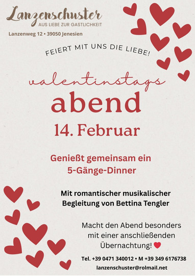 Celebrate l’amore con una serata speciale al Lanzenschuster. Vi aspetta una raffinata cena di San Valentino con menu a 5 portate, accompagnata da musica romantica dal vivo con Bettina Tengler, per un’atmosfera intima e suggestiva.