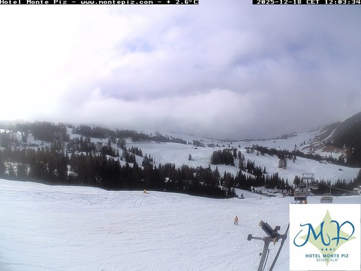 Panorama dall’Albergo Monte Piz, al centro dell’Alpe di Siusi: l'Altopiano ricoperto dalla neve con le sue piste da sci in inverno e verdi prati e boschi in estate. In lontananza il massiccio dello Sciliar, uno dei simboli dell’Alto Adige. Date un’occhiata a questa webcam per scoprire le condizioni meteo e della neve dell’Alpe di Siusi nel comune di Castelrotto.