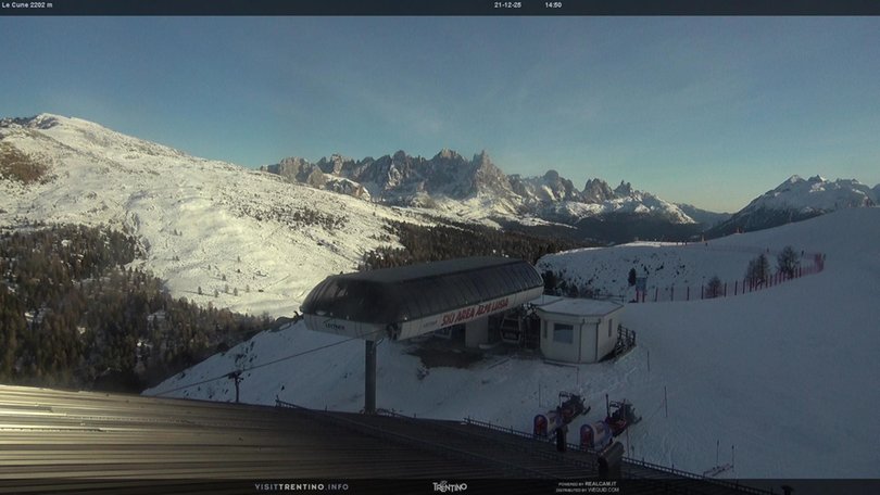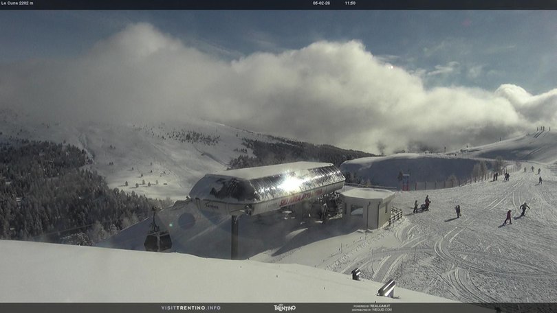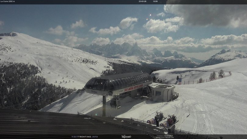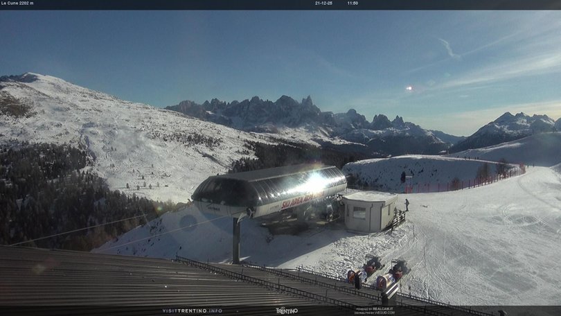 La webcam si trova presso il punto panoramico Le Cune, nella Skiarea Alpe Lusia, al confine con il Parco Naturale di Paneveggio. In primo piano la stazione a monte della cabinovia Valbona-Le Cune. L’impianto serve le piste "Direttissima Le Cune" e "Cune-Campo", che collegano l’Alpe Lusia con Bellamonte. Sullo sfondo le cime delle Pale di San Martino e della catena del Lagorai.Questa webcam permette di verificare in ogni momento le condizioni meteo e della neve in questa zona del Trentino nei pressi del Parco Naturale di Paneveggio.