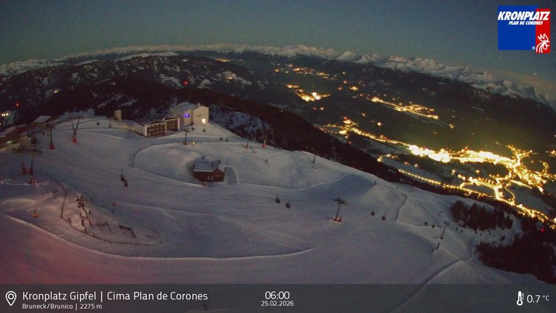 La webcam si trova sulla cima del Plan de Corones e offre una bella vista su Brunico. Si possono ammirare la vetta del Plan de Corones, il Museo LUMEN, le cabinovie Ried (Perca) e Plan de Corones 1+2 (Riscone). In inverno, il Plan de Corones è una rinomata area sciistica, mentre in estate si trasforma in un paradiso per escursionisti. Consulta questa webcam per scoprire in tempo reale le condizioni meteo e della neve nel comprensorio Plan de Corones / Kronplatz.