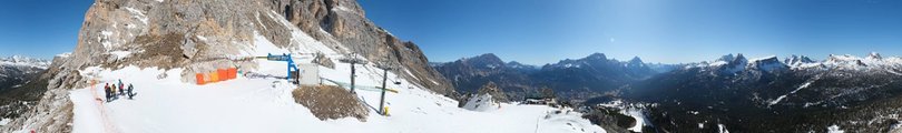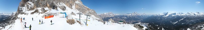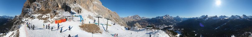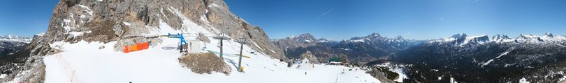 Panorama verso il Rifugio Pomedes nella Skiarea Socrepes-Pocol-Tofana-Falzarego. In primo piano la stazione a monte della seggiovia Pomedes n.22, aperta anche d’estate, e al centro dell’immagine il Rifugio Pomedes, costruito nel 1955. Sullo sfondo incredibile vista verso Cortina d’Ampezzo e il Cadore con le cime di Monte Cristallo, Sorapiss, Marmarole e Antelao. Consulta la live cam per scoprire le condizioni meteo e della neve in questo comprensorio sciistico di Cortina.