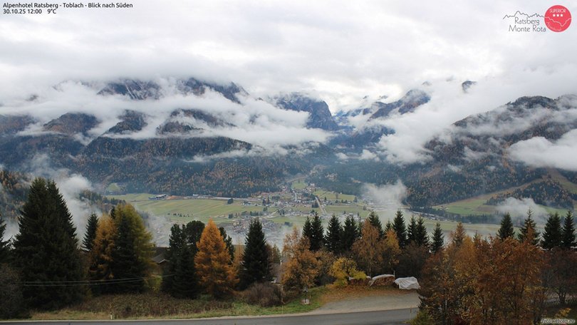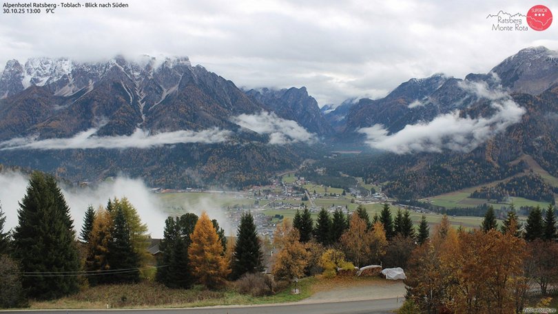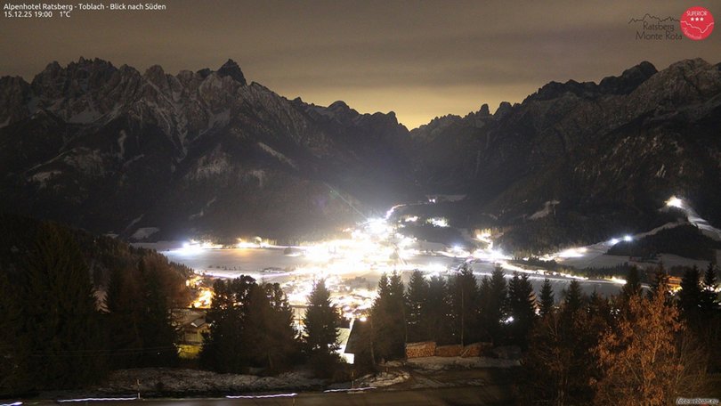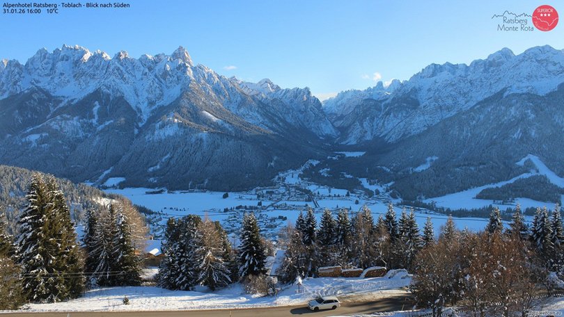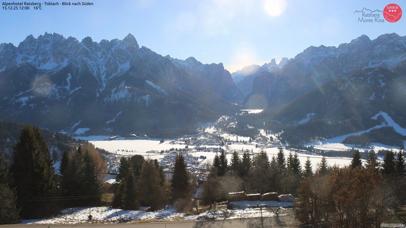 Vista dall’Alpenhotel Ratsberg a Monte Rota verso la Val di Landro, con il paese di Dobbiaco e il suo lago. Sullo sfondo del panorama le Dolomiti: dalla Cima di Sesto alla Rocca dei Baranci sulla sinistra, l’Antelao al centro e da Piz Popena, Monte Cristallo e Croda Rossa fino al Monte Cavallo sulla destra. Questa webcam offre un punto d'osservazione ideale per conoscere le condizioni meteo e della neve nella zona di Dobbiaco in Alta Pusteria!