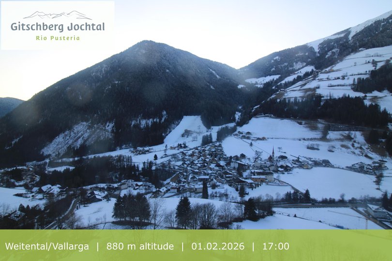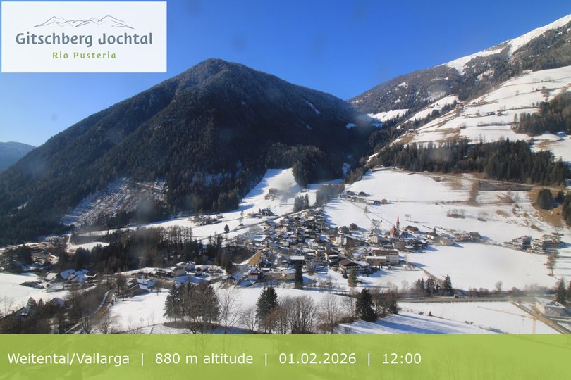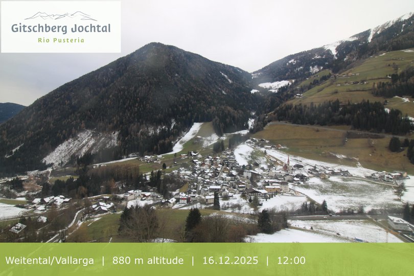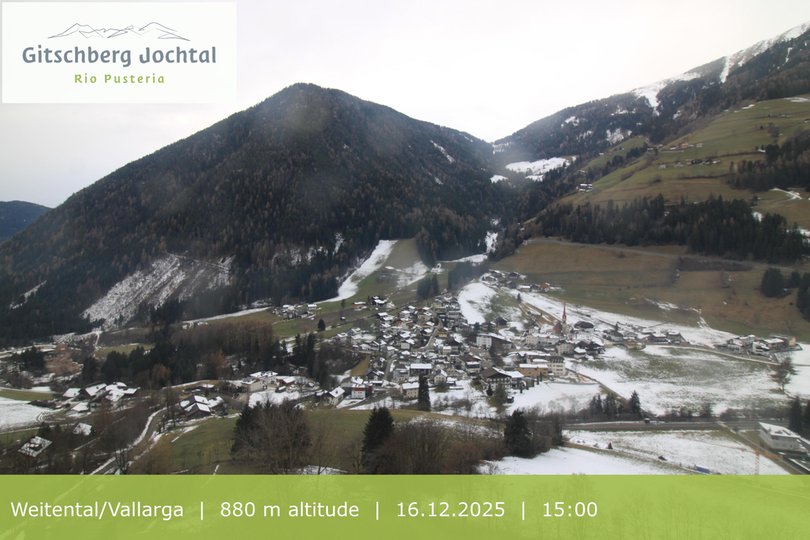 Questa webcam offre una vista sull'abitato di Vallarga, nella Val di Fundres. Vallarga è una delle frazioni di Vandoies in Val Pusteria. A destra nell'immagine si può vedere la chiesa parrocchiale di San Tommaso. Siamo in Alto Adige, nella zona del comprensorio sciistico e escursioistico Gitschberg Jochtal - Rio Pusteria, paradiso dello sci e delle escursioni.