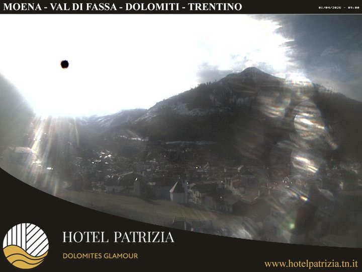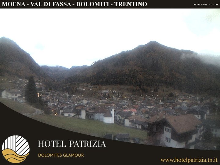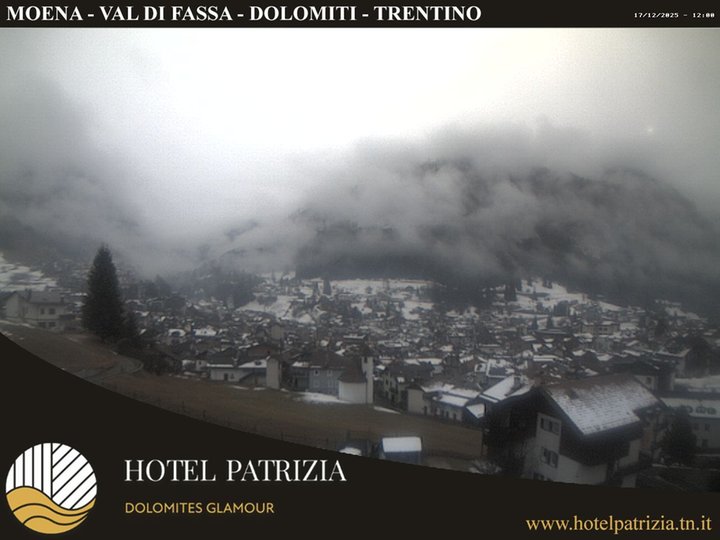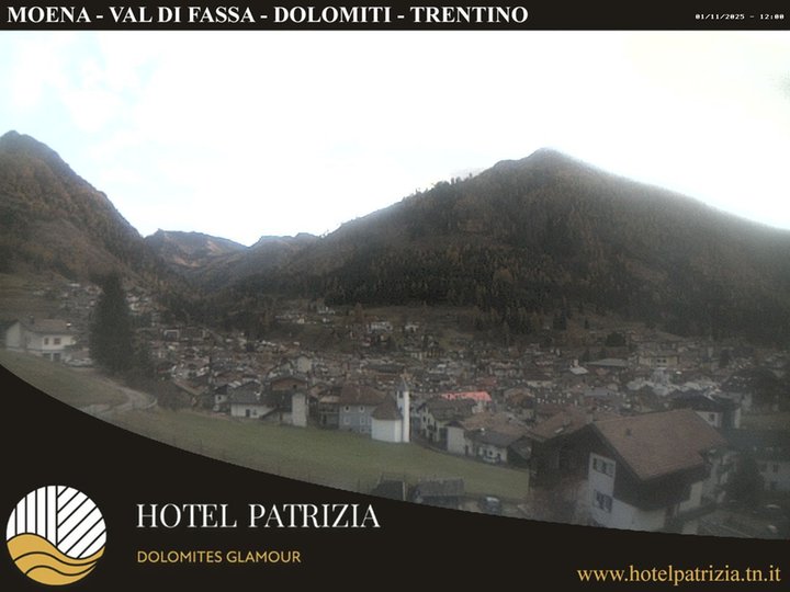 Panorama sul paese di Moena e le montagne che lo circondano: Piz Meda, Gronton e Sas de Mesdì. Sullo sfondo anche la valle di San Pellegrino e l'Alpe Lusia. Grazie a questa webcam, installata sul tetto dell’hotel Patrizia, è possibile vedere Moena e le sue cime ricoperte di neve in inverno e le condizioni meteo della zona in qualsiasi momento dell’anno!