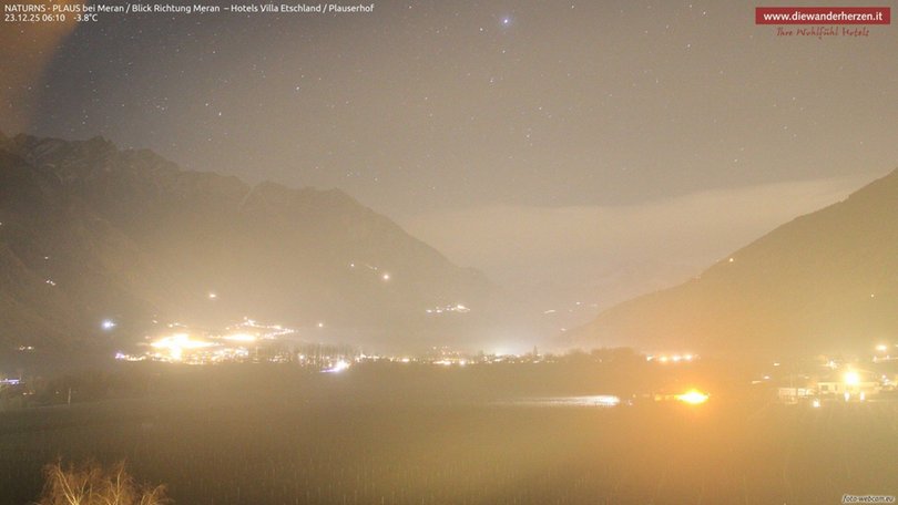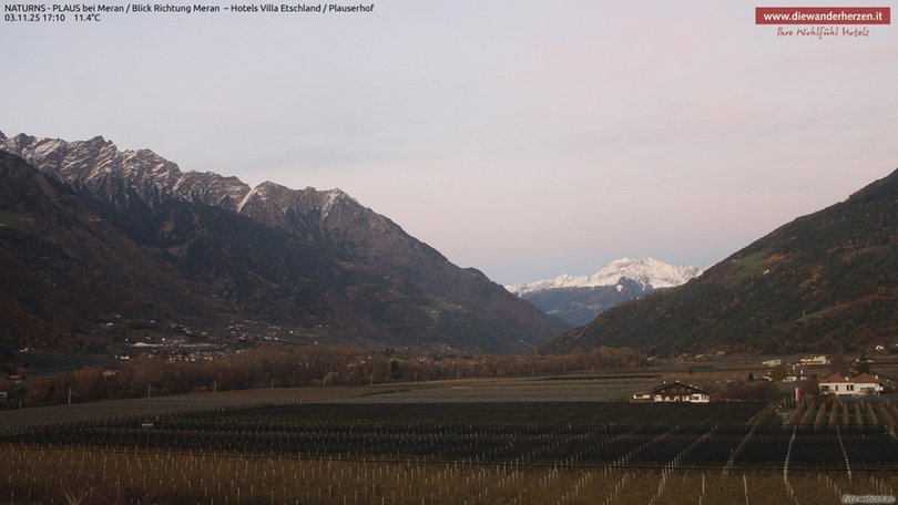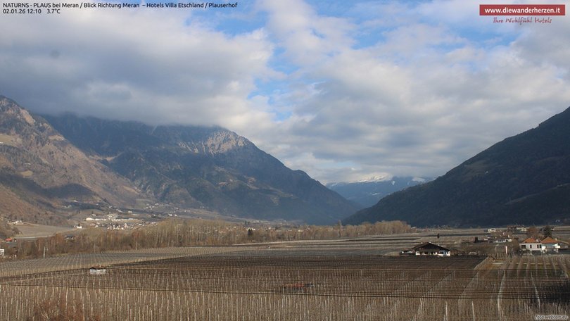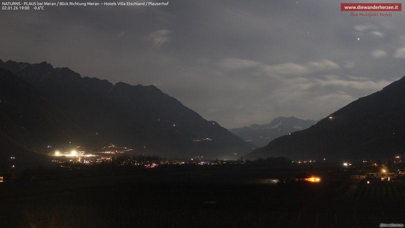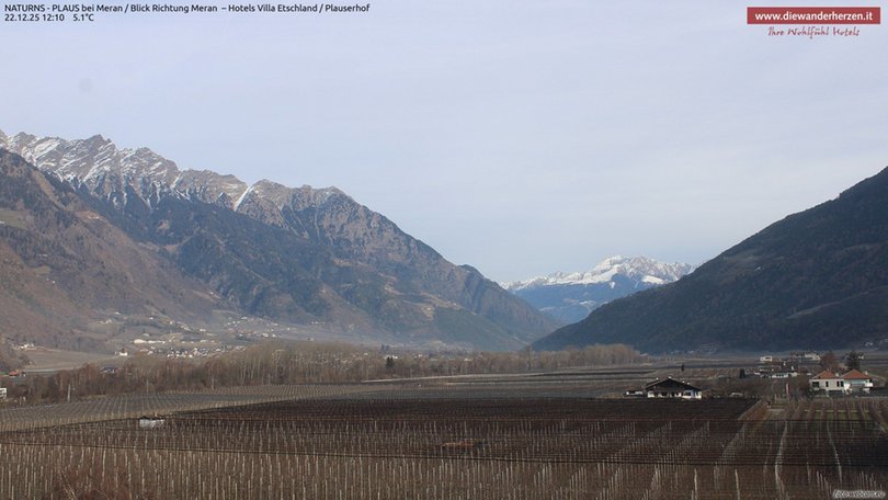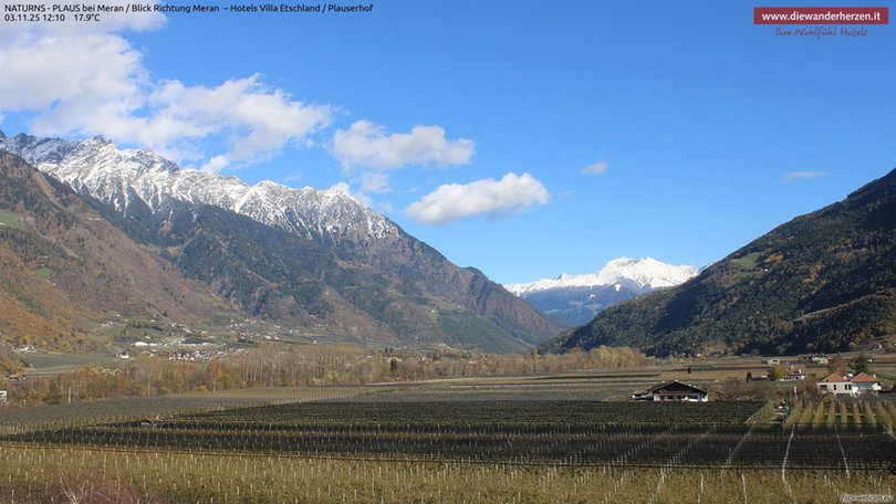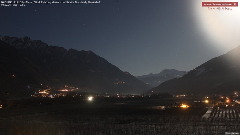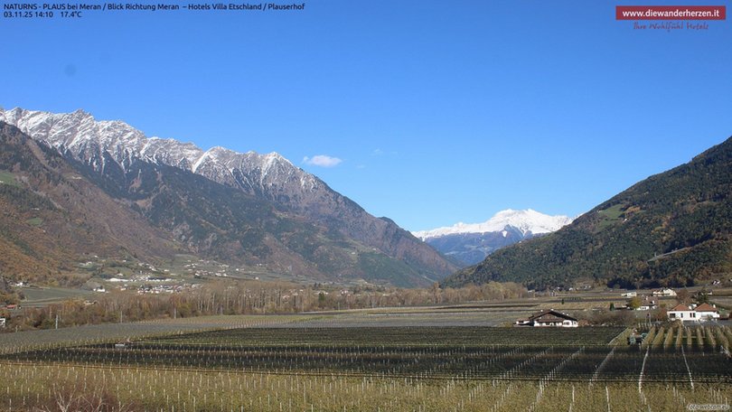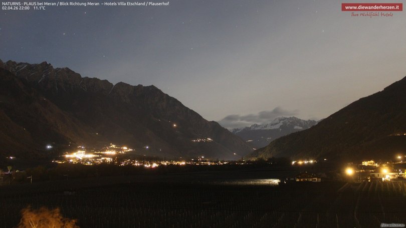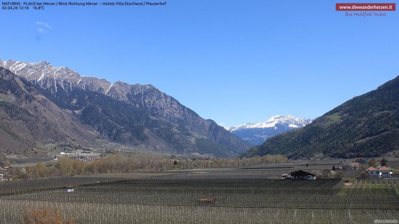 Vista panoramica verso Merano e dintorni dal Park Hotel Villa Etschland di Plaus (Naturno). La webcam permette di vedere a sinistra il paradiso escursionistico del Parco Naturale Gruppo di Tessa con una parte della rinomata Alta Via di Merano. Al centro si vedono Picco Ivigna e Punta Cervina, tutto a destra la vista si apre verso l’area escursionistica del Monte San Vigilio. Consulta questa webcam per sapere che tempo fa nella zona a ovest di Merano.
