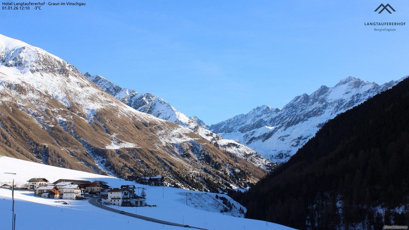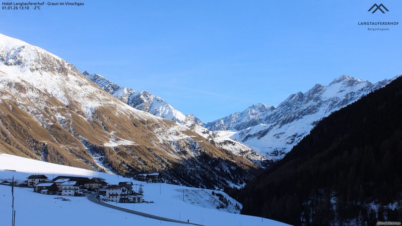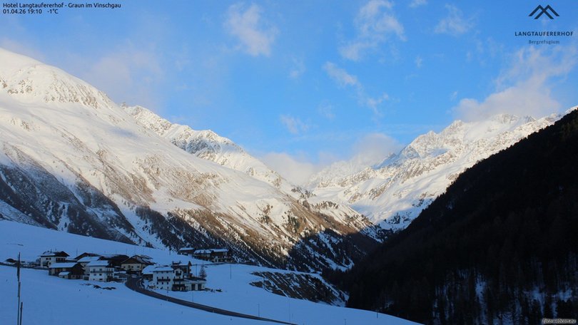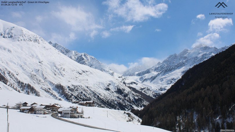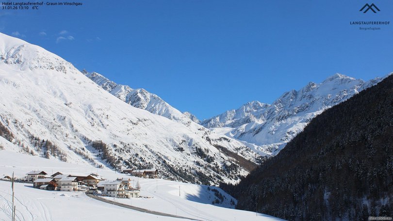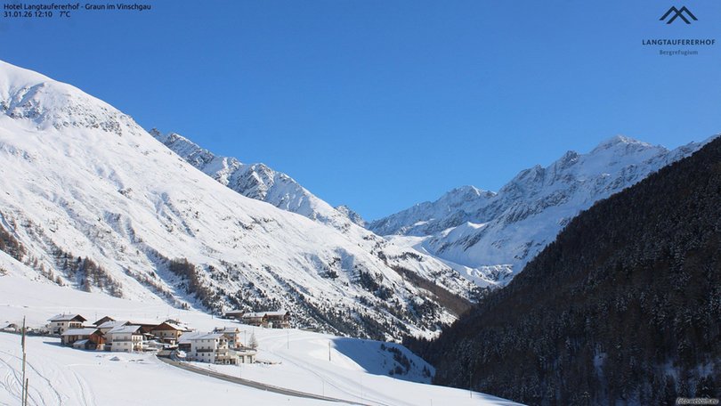 Vista panoramica dalla frazione Cappella di Curon sulla Vallelunga, valle che si estende da Curon fino a Melago. La valle è una meta ambita per gli amanti di mountain bike, trekking e camminate in estate e gli appassionati di sci alpino e snowboard, sci alpinismo e di fondo in inverno. Dall’hotel che possiede la webcam i Tremila della Val Venosta sono a portata di mano: Palla Bianca, cima del Lago Bianco, monte Cantone, ecc. Grazie a questa webcam le condizioni meteo e della neve della Vallelunga le potete sempre controllare qui!