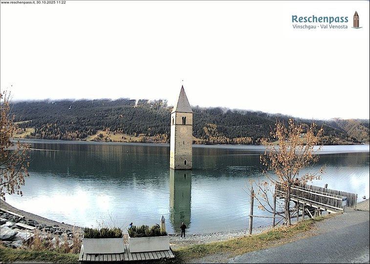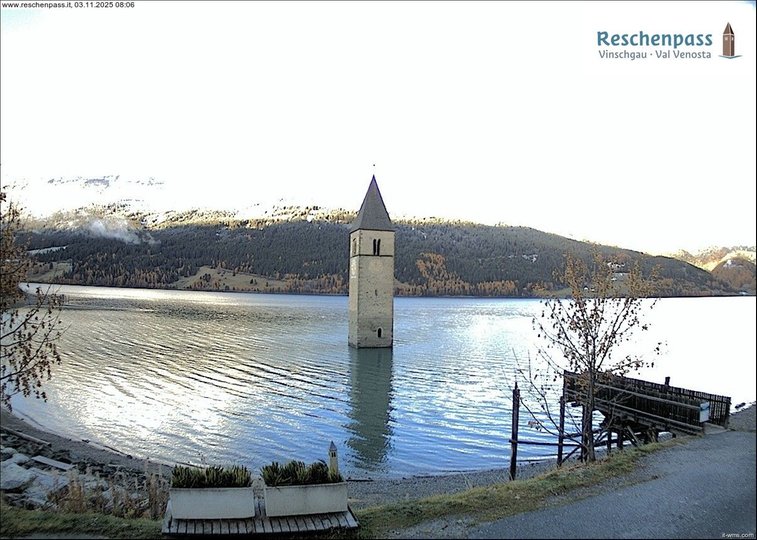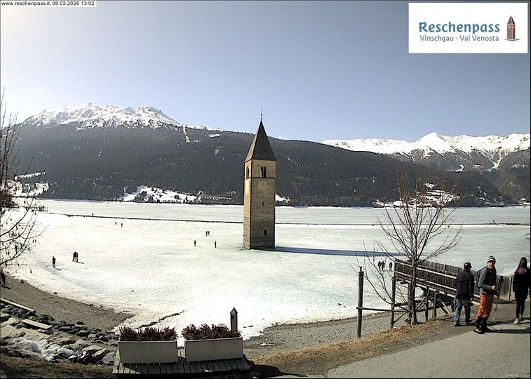 Vista panoramica sul lago di Resia e il famoso campanile di Curon in Val Venosta. Questo lago artificiale è nato nel 1950 dall’unificazione dei due laghi di Resia e di Curon sommergendo il piccolo paese di Curon Venosta e parte del paese di Resia, ricostruiti più a monte. Il famoso campanile romanico che spunta dall’acqua è l’unico testimone della storia di questo lago, ricca di leggende. Questa webcam è ideale per scoprire che tempo fa sul lago di Resia e vedere le condizioni del ghiaccio in inverno quando sul lago si pratica il pattinaggio, lo sci di fondo, lo snowkiting e la slitta a vela. In estate le acque del lago e i venti frequenti sono ideali per i praticanti di kitesurfing e la vela.