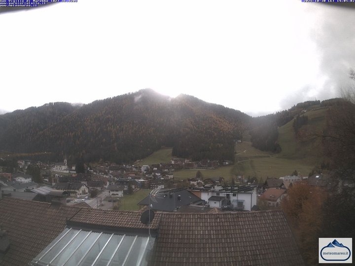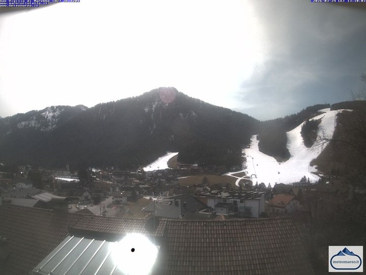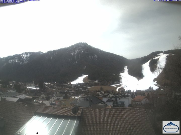 Panorama di San Vigilio di Marebbe verso la telecabina Pedagà - Piz de Plaies che collega il comprensorio sciistico Plan de Corones con Piccolino, in Val Badia. Da lì si può risalire al Piz de Plaies con l'impianto Piculin. Sulla sinistra il centro di San Vigilio con la sua Parrocchia del 1780. La webcam è un punto di osservazione ideale per scoprire le condizioni del meteo e della neve a Marebbe.