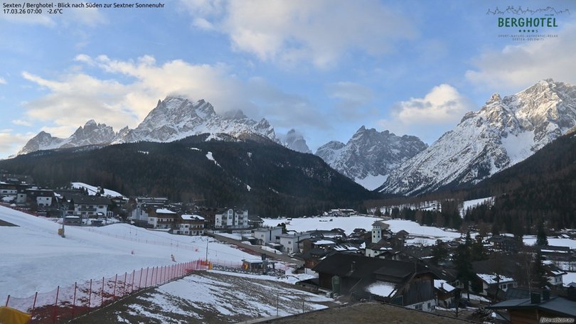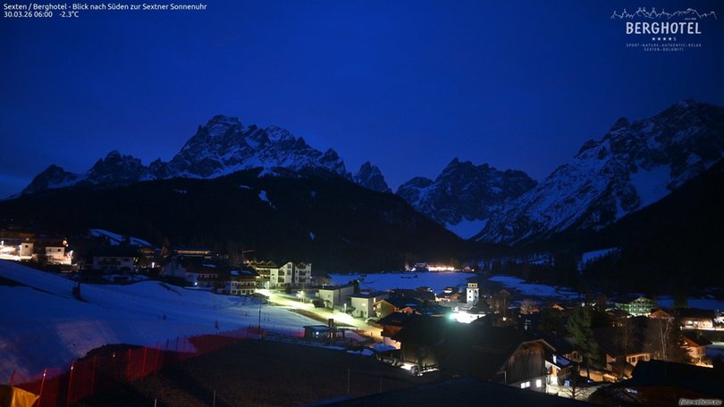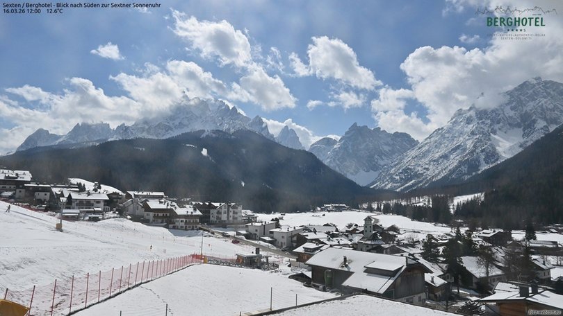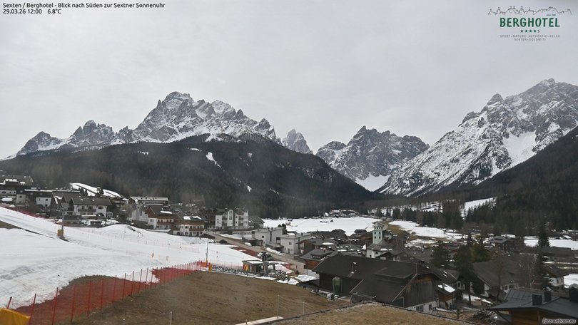 Vista da Moso in Alta Pusteria, verso sud, sulla Meridiana di Sesto composta da Cima Nove, Dieci, Undici, Dodici e Uno. La Meridiana si trova al confine con il Parco naturale Tre Cime. In inverno il paesaggio è imbiancato dalla neve e in estate è caratterizzato da prati e boschi verdi. In primo piano la piscina del Berghotel che ospita la webcam.