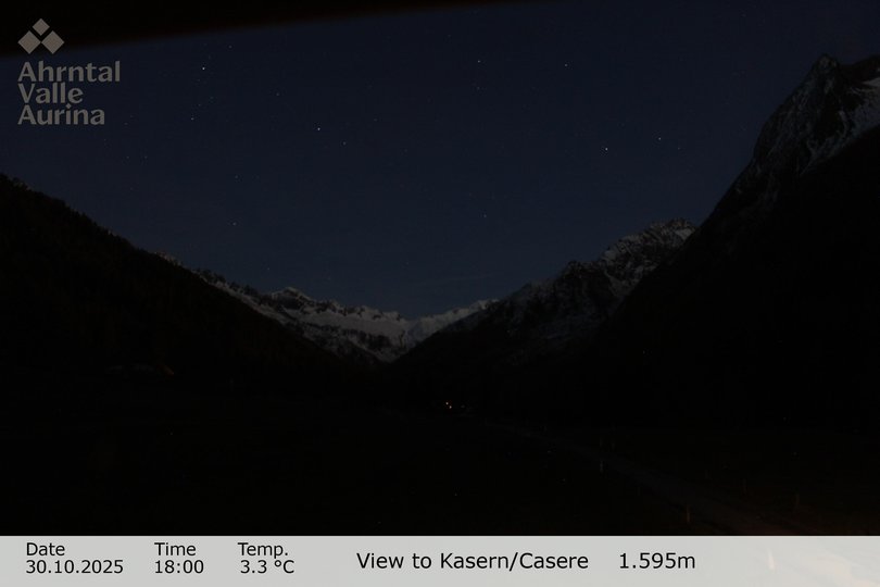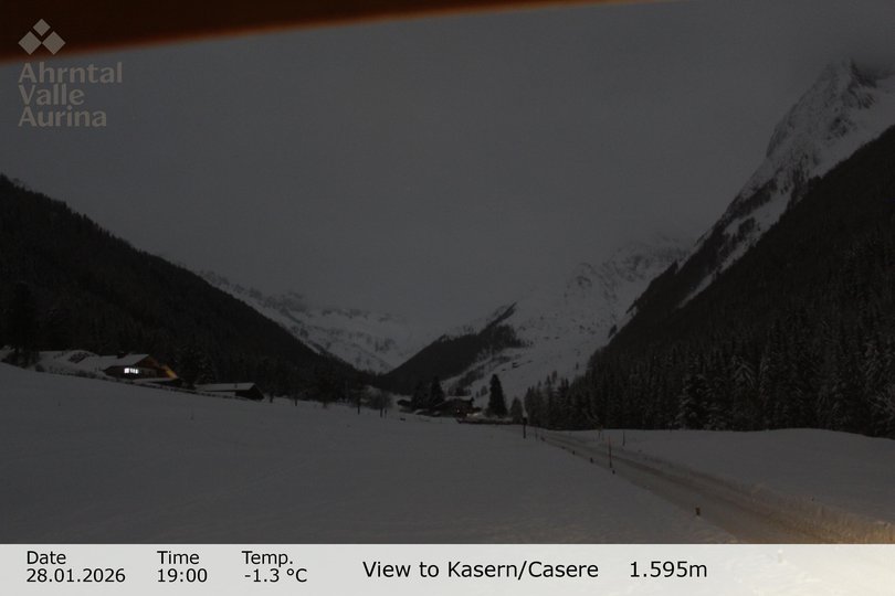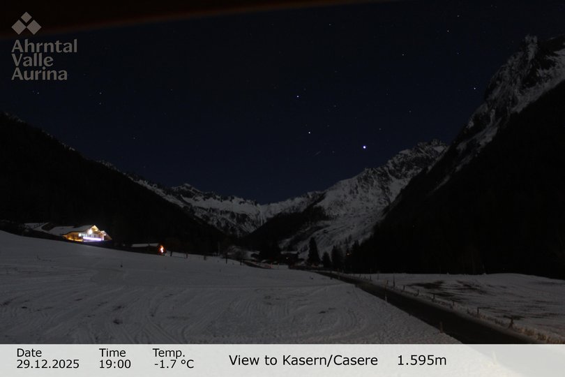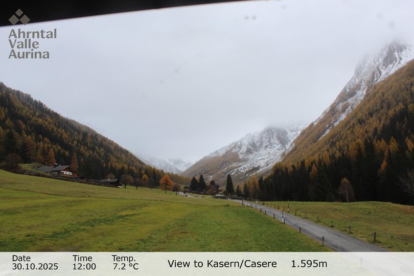 Vista verso il fondovalle della Valle Aurina con la Chiesetta di Santo Spirito, la chiesa più a nord del territorio italiano. In inverno, grazie a questa webcam, si possono vedere ricoperti dalla neve lo Snowpark Casere con le piste di slittino e snowtubing e la pista "Fondo del sole Casere" per lo sci nordico. In estate i verdi prati e boschi della Valle Aurina dominano il paesaggio.