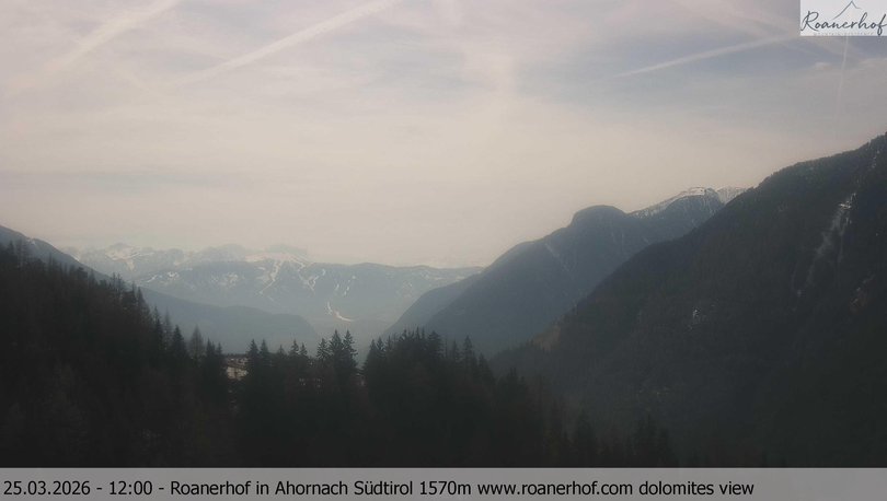 Vista panoramica sulla Valle di Tures. Si può scorgere l'abitato di Campo Tures e, sullo sfondo, il Plan de Corones fino all'Alpe di Fanes Piccolo e addirittura la Marmolada. Questa webcam, installata sul Mountain Residence Roanerhof, è perfetta per osservare le condizioni del meteo in Val di Tures e nelle Dolomiti circostanti.
